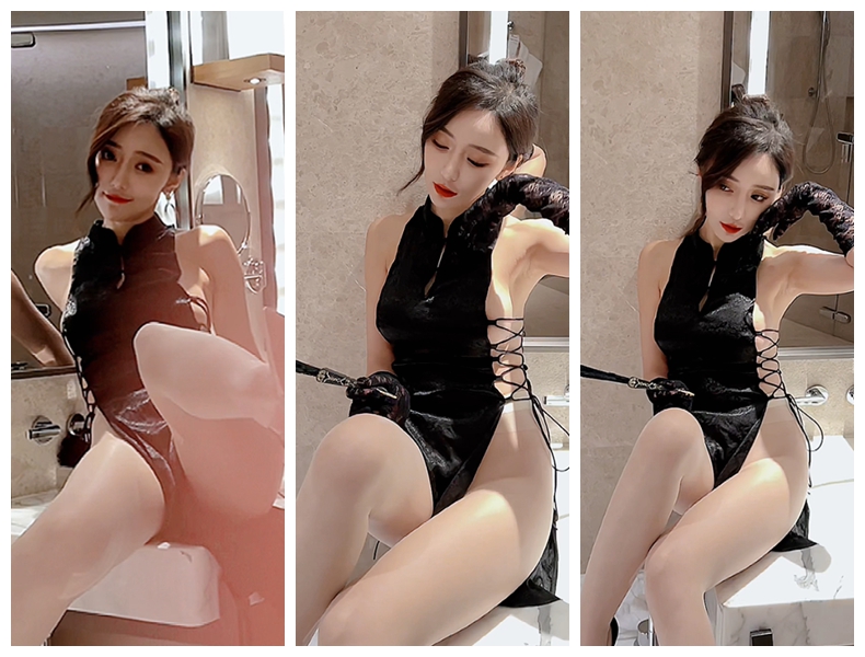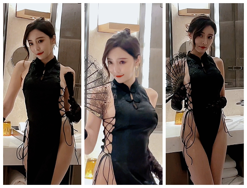 【永久专享】超人气▲王馨瑶▲黑色旗袍 无内肉丝